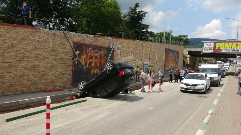 Kaza, merkez Osmangazi ilçesinde Demirtaşpaşa köprülü kavşağında meydana geldi. Edinilen bilgiye göre, İnönü Caddesinden Gökdere istikametine giden 16 ADG 987 plakalı otomobilin sürücüsü Ayşe M., Demirtaşpaşa kavşağında virajı alamadı. Kontrolden çıkan otomobil demir korkulukları aşarak 3 metre yükseklikten aşağı uçtu. O esnada kaldırımda yürüyen bir yaşlı adam uçan arabanın altında kalmaktan saniyelerle kurtuldu.