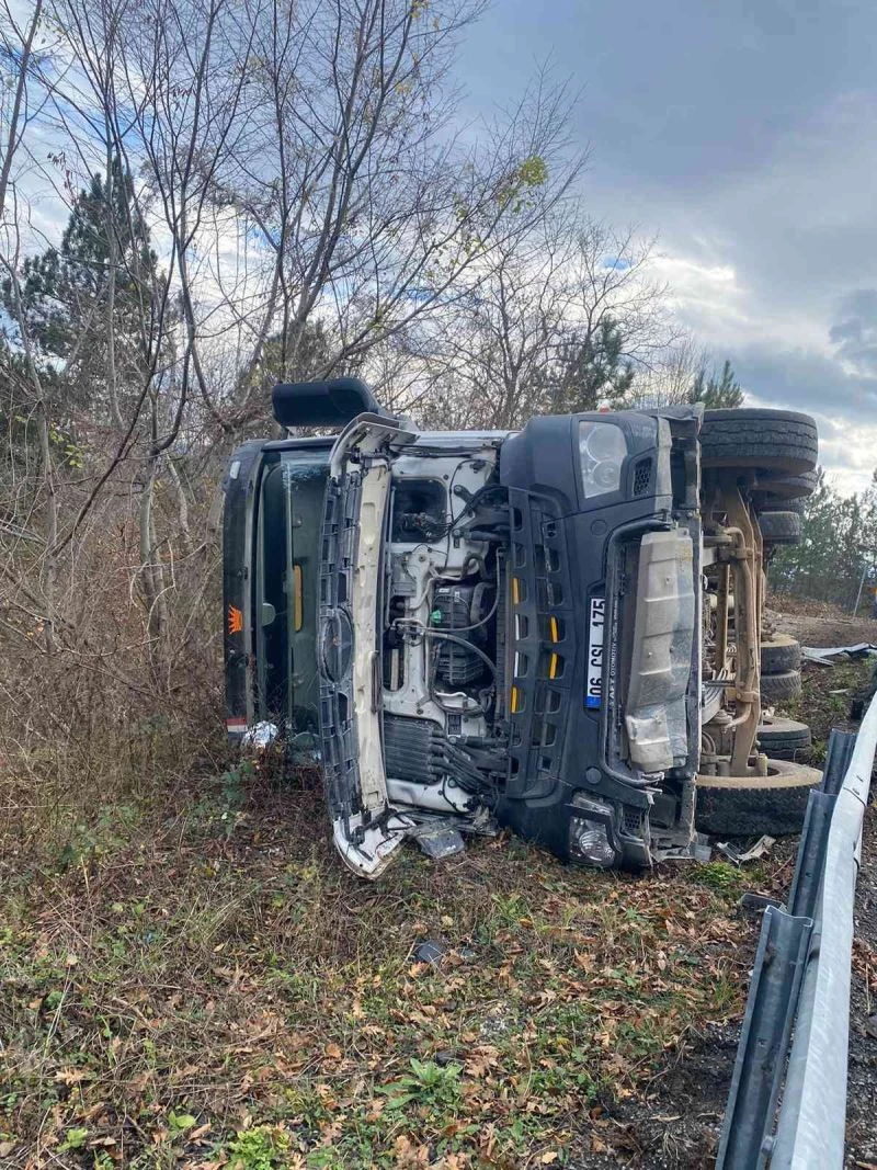Kastamonu’nun Çatalzeytin ilçesinde virajı alamayarak devrilen kamyonun sürücüsü yara almadan kurtuldu.