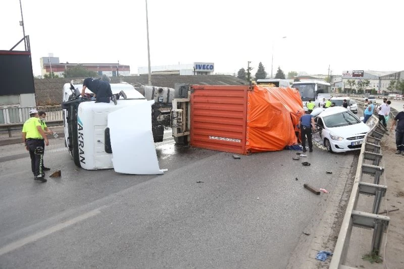 Virajı alamayan tır üzerine devrildiği otomobili hurdaya çevirdi: 2 yaralı