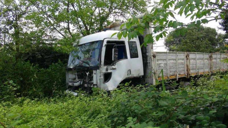 Kocaeli’de virajı dönen kamyon önce yol kenarındaki duvarlara çarptı, ardından ağaçlık alana girerek durabildi.