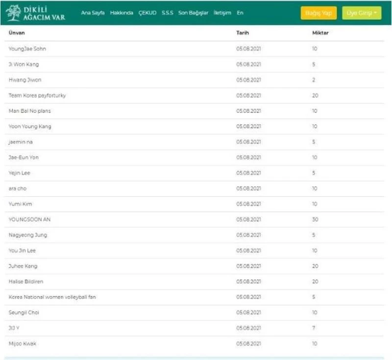 ’Dikili ağacım var’ sitesinden yayımlanan bağışçı listesinde Koreliler bir anda üst sıralara çıktı. Sosyal medya kullanıcıları, ’Kim Yeon-Kyung adına fidan bağışlamaya ne dersiniz? Bence harika bir fikir’, ’Beş tane fidan bağışladım bile’ ’Türkiye’de yangın çıktığını voleybol maçı izlerken öğrendim’ gibi mesajlar yayımladılar.