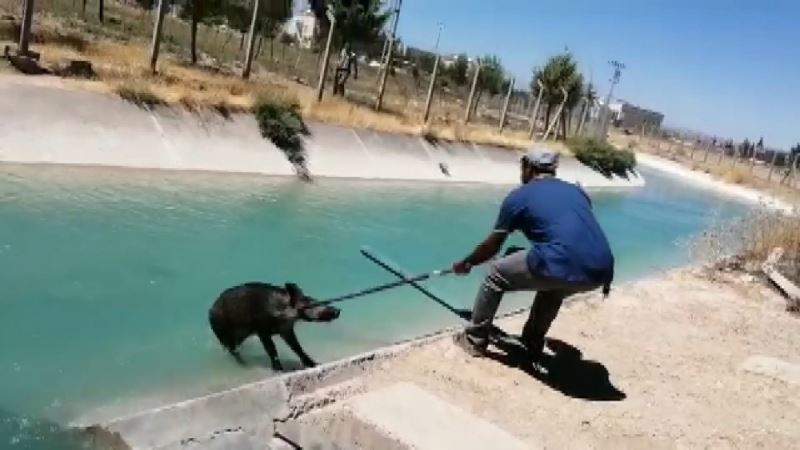 Adıyaman’ın Samsat ilçesinde sulama kanalına düşen yaban domuzunu kurtarmak için vatandaşlar "gel" diye çağırdı. Suda yüzen yaban domuzu güçlükle çıkartıldı.