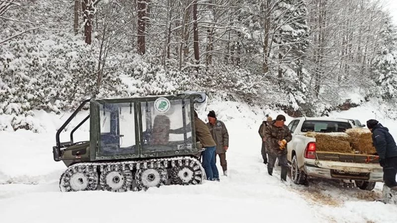 Düzce’de kar yağışı nedeniyle aç kalan yaban hayvanları için doğaya yem bırakıldı.