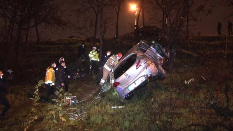 Yağış nedeniyle kayganlaşan yolda kontrolden çıkan otomobil şarampole yuvarlandı