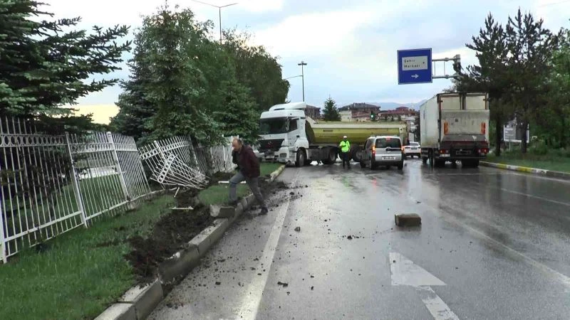 Yağış sonrası kayganlaşan yolda direksiyon hakimiyetini kaybeden kamyon refüje çıktı