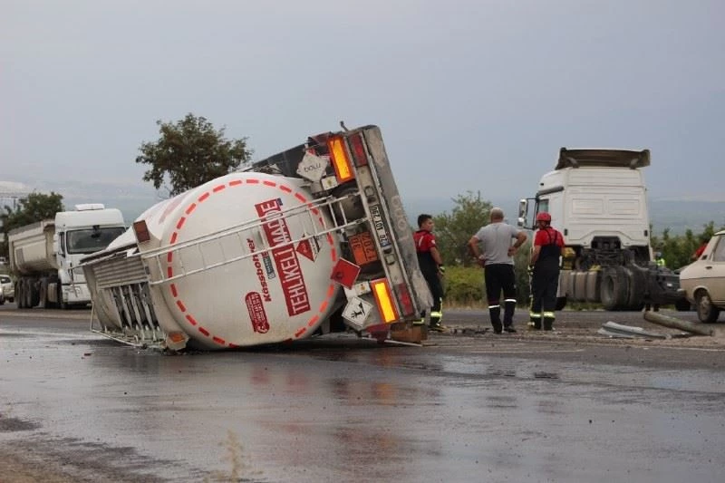 Yağışla birlikte kontrolden çıkan yakıt tankeri devrildi