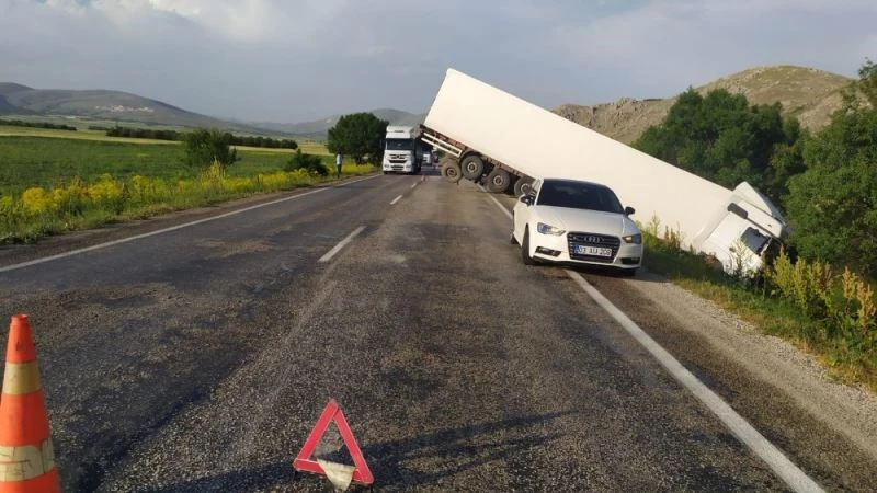 Afyonkarahisar’ın Şuhut ilçesinde sağanak yağmur nedeniyle kayganlaşan yolda tırın kontrolden çıkması sonucu meydana gelen trafik kazasında şans eseri yaralanan olmadı.