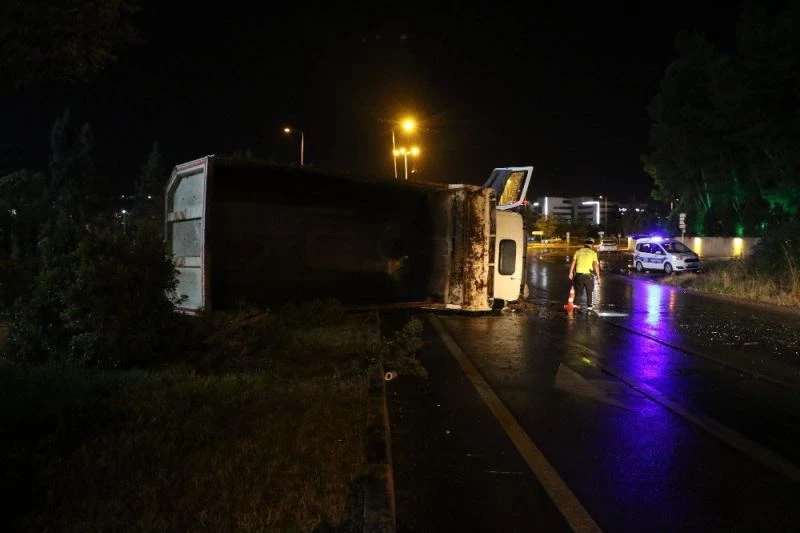 Yağmur sonrası kayganlaşan yolda kamyon devrildi: 1 yaralı