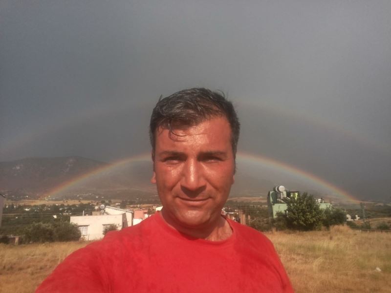 Adana’nın Kozan ilçesinde yağmur sonrası oluşan gökkuşağını gören vatandaş cep telefonuna sarılarak sosyal medya hesabından takipçilerine spiker gibi olayı anlattı.
