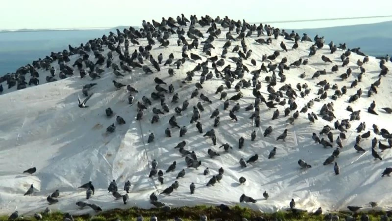 Pazarın yanındaki boş arazide bulunan ve üzeri branda ile kapatılan buğday yığını üzerinde bekleyen kuşlar brandayı delerek buğday tanelerinden yemeye çalışıyor.