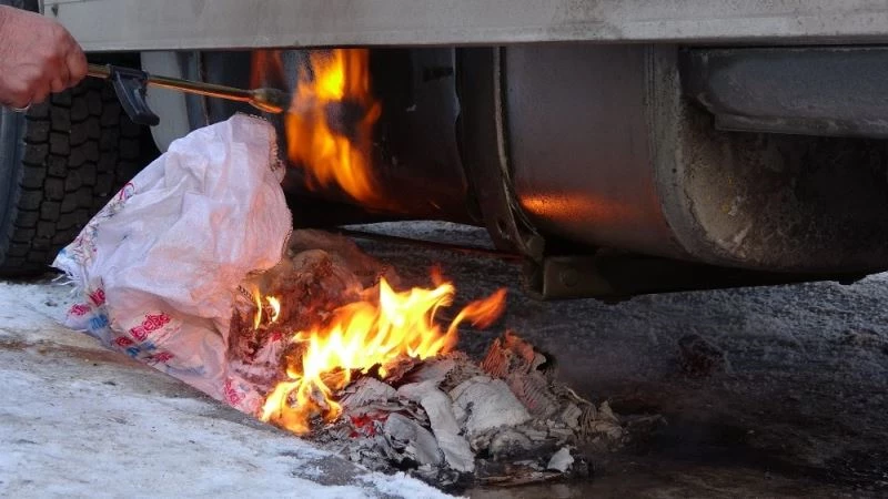 Ardahan’da soğuk hava aracın motorunu dondurdu. Vatandaş, kargo tırını çalıştıramayınca altına odun, kağıt koyup yaktı donan motor çalıştı.