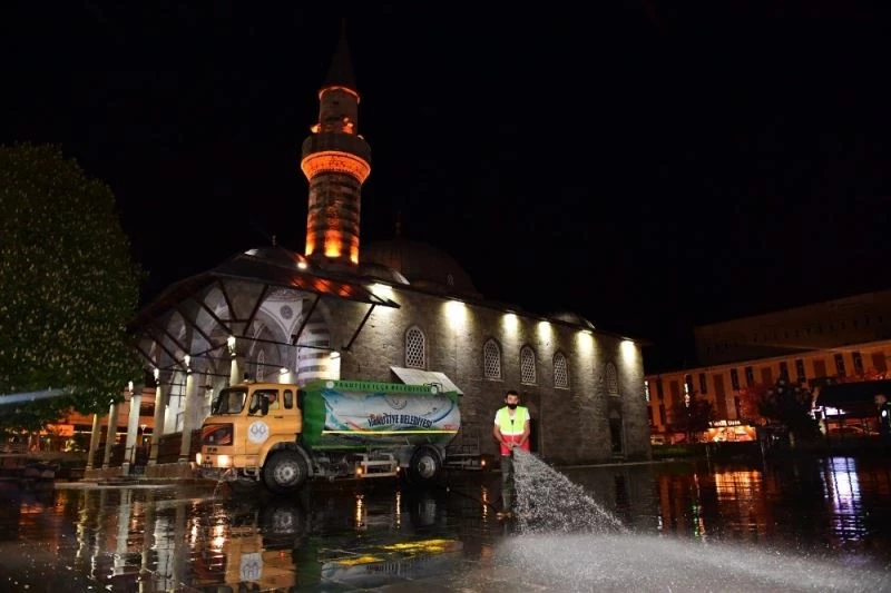 Yakutiye Belediyesi Temizlik İşleri Müdürlüğü ekipleri, yarın kılınmaya başlanacak olan cuma namazı öncesi ilçe merkezindeki meydan ve cami bahçelerinde hummalı bir temizlik çalışması başlattı.
