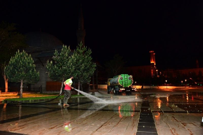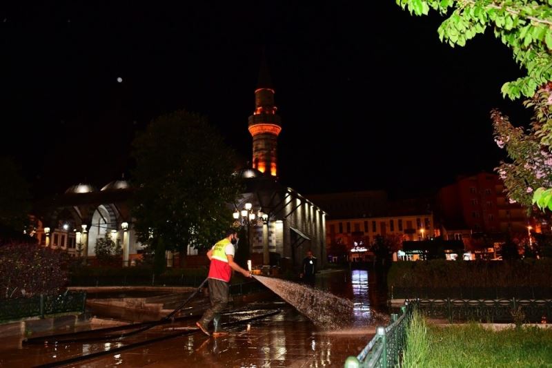 Erzurum Yakutiye Belediyesi gece sabaha kadar temizlik yaptı, namaz kılınacak alanlar sosyal mesafe kurallarına göre dizayn ediliyor.