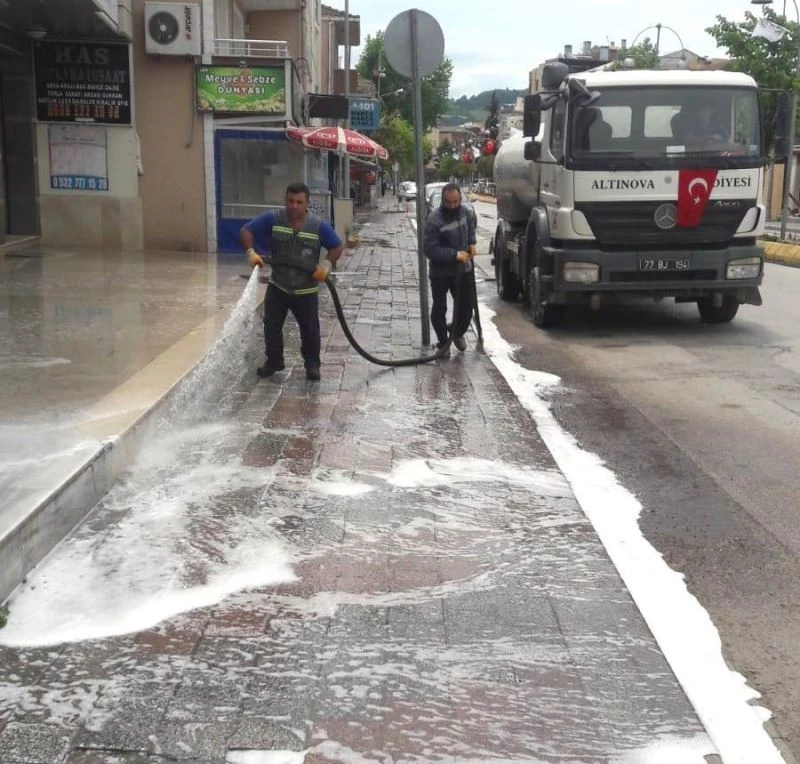 Yalova Altınova Belediyesi, dünyayı etkisi altına alan Covid-19 salgınına karşı aldığı tedbirler kapsamında yolları yıkayıp, ilçeyi karış karış ilaçlayarak dezenfekte etti.