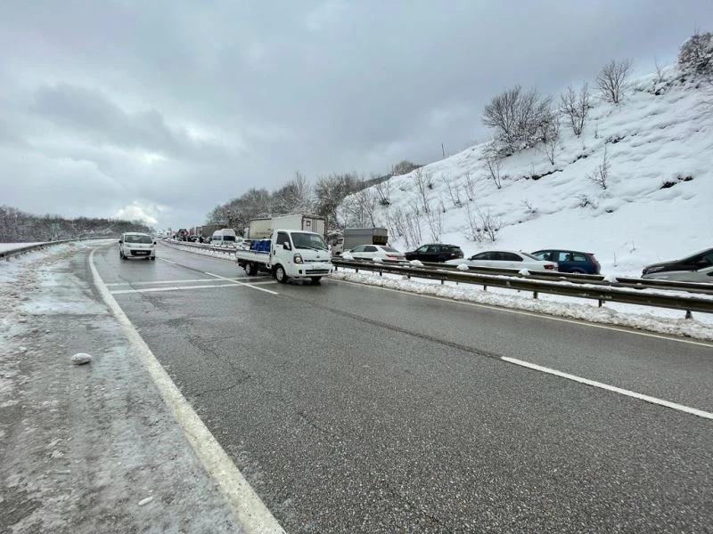 Yalova-Bursa kara yolunda kayan tırın dorsesinin yolu kapatması yüzünden uzun araç kuyrukları oluştu.