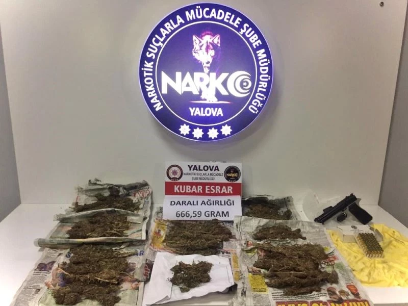 Yalova Emniyet Müdürlüğü Narkotik Suçlarla Mücadele Şube Müdürlüğü yapılan çalışmalar neticesinde Yalova ve Kocaeli ilinde uyuşturucu ticareti yapan kişileri tespit etti. Yapılan teknik takip sonrasında düğmeye basan Yalova polisi Kocaeli’nin Karamürsel ilçesi ve Yalova il merkezinde belirlenen adreslere eş zamanlı operasyonlar gerçekleştirdi. Baskın gerçekleştirilen adreslerde yapılan aramada 666,59 gram esrar maddesi ile 9 mm çapında 1 adet tabanca ile 9 mm çapında 40 adet mermi ele geçirildi. Operasyonlar kapsamında İ.D(3 9) M.D(57) Ş.A(47) ve N.Y(33) adlı 4 kişi gözaltına alındı. Haklarında uyuşturucu veya uyarıcı madde imalatı ve ticareti suçundan adli işlem yapılan şahıslar adliyeye sevk edildiler.