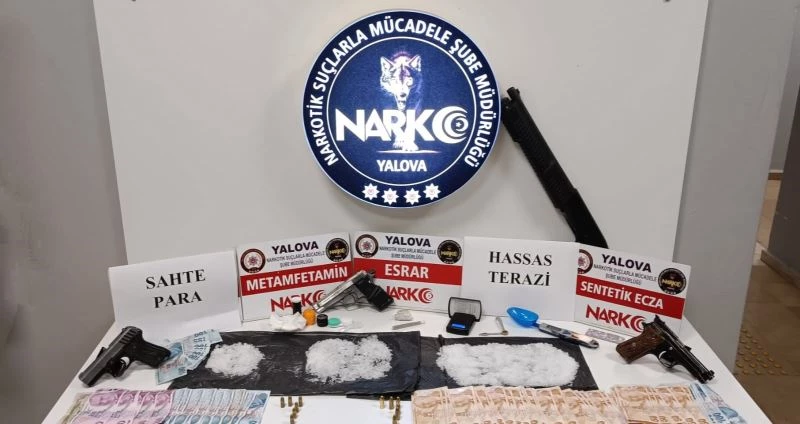İstanbul’dan feribotla Yalova’ya uyuşturucu getireceği belirlenen zanlılara yönelik düzenlenen operasyonda Y.Ö., Ö.G. ve B.D. gözaltına alındı. Şahısların feribota bindiği 77 plakalı otomobil ve üst aramalarında 420 gram metamfetamin, 1.19 gram sentetik kannabinoid, 0.61 gram esrar, 5 sentetik ecza grubu tablet hap, 3 tabanca, tüfek, 3 hassas terazi ve 2 bin 600 TL sahte para ele geçirildi.