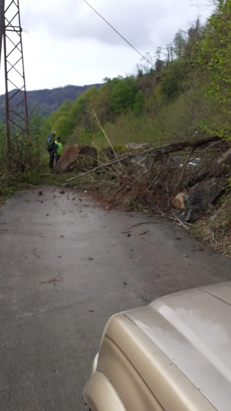 Artvin’in Arhavi ilçesinde yamaçtan kopan dev kaya parçaları köy yolunu ulaşıma kapattı.