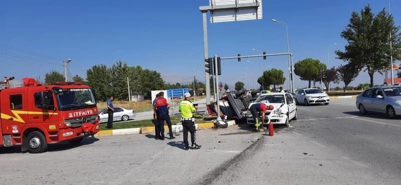 Denizli’de iki otomobilin kavşakta çarpışması sonucu meydana gelen kazada yan yatan araçtaki 3 kişi yaralandı.