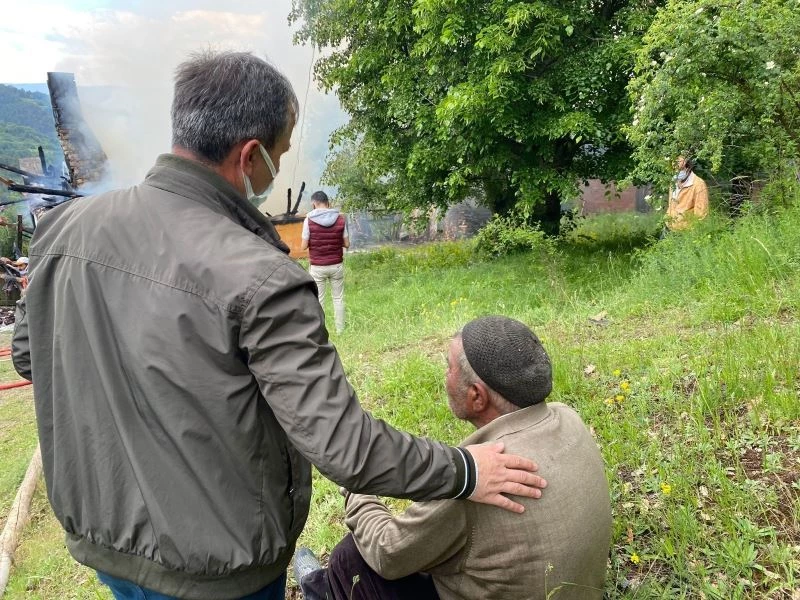 Kastamonu’nun Hanönü ilçesinde sobadan sıçrayan kıvılcımlardan çıktığı tahmin edilen yangında, iki katlı ahşap ev tamamen yanarak küle döndü. Çimenlerin üzerine oturarak yanan evini gözyaşlarıyla izleyen ev sahibini ise belediye başkanı ve köylüler sakinleştirdi.