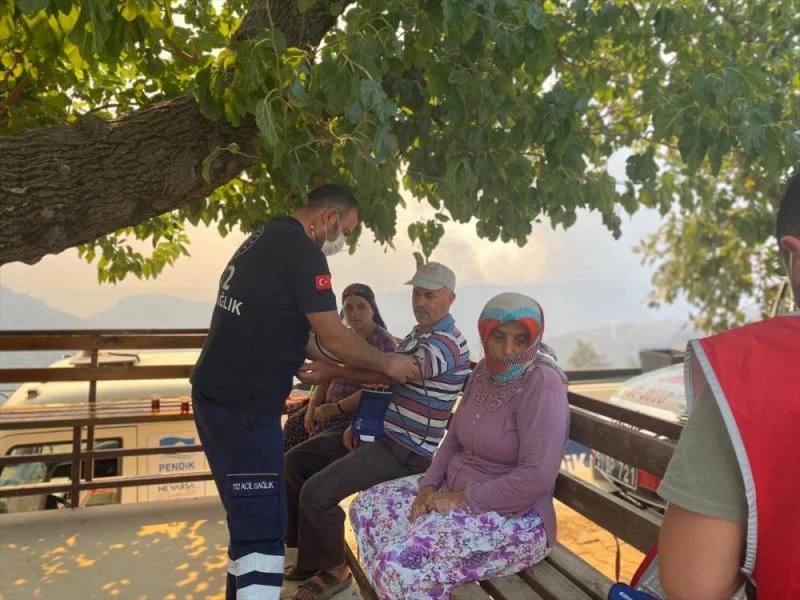 Antalya'da 46 ambulans, 17 UMKE ekibi, 1 mobil komuta aracı, toplam 242 sağlıkçıyla yangın bölgelerinde çalışmalarını sürdüren Sağlık Bakanlığının ekipleri, zarar gören vatandaşları ziyaret ederek, ateş, şeker, tansiyon ölçümünü gerçekleştiriyor.