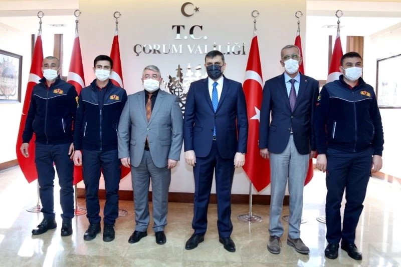 Çorum Valiliğinde düzenlenen törende Çorum Belediyesi İtfaiye Müdürlüğü ekip amiri Murat Tıraş ve itfaiye erleri Kamil Hombaç ile Ali Öremiş’e başarı belgeleri Vali Mustafa Çiftçi ve Belediye Başkanı Dr. Halil İbrahim Aşgın tarafından verildi.