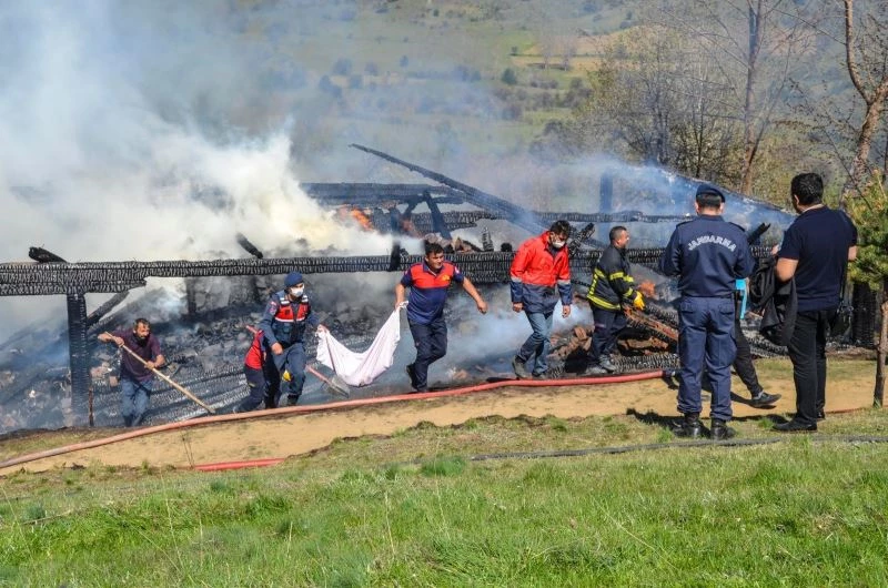 Kastamonu’nun Taşköprü ilçesinde piknik tüpünün patlaması sonucu bir evde çıkan yangında hayatını kaybeden Hamdi Demir’in cenazesi enkazdan çıkartıldı.