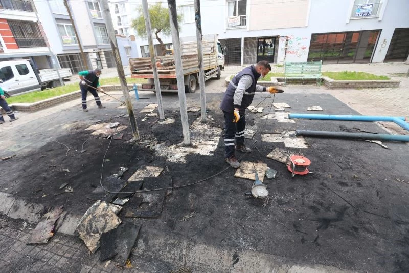 Orta Mahalle 209 Sokak’ta bulunan ve 3 Şubat Cumartesi günü kimliği belirsiz kişiler tarafından ateşe verilmesi sonucu kullanılamaz hale gelen Maksut Doğan Parkı’nda; yangının izleri hızla siliniyor. Efeler Belediyesi Park ve Bahçeler Müdürlüğü ekipleri, söz konusu parkta neredeyse küle dönen çocuk oyun gruplarını temizledi.