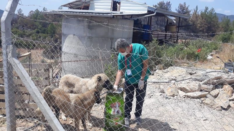 Alanya Belediyesi Veteriner İşleri Müdürlüğü’ne bağlı ekipler, yangın afetinin etkili olduğu Bayır Mahallesi’nde, sokak hayvanları için çalışıyor.