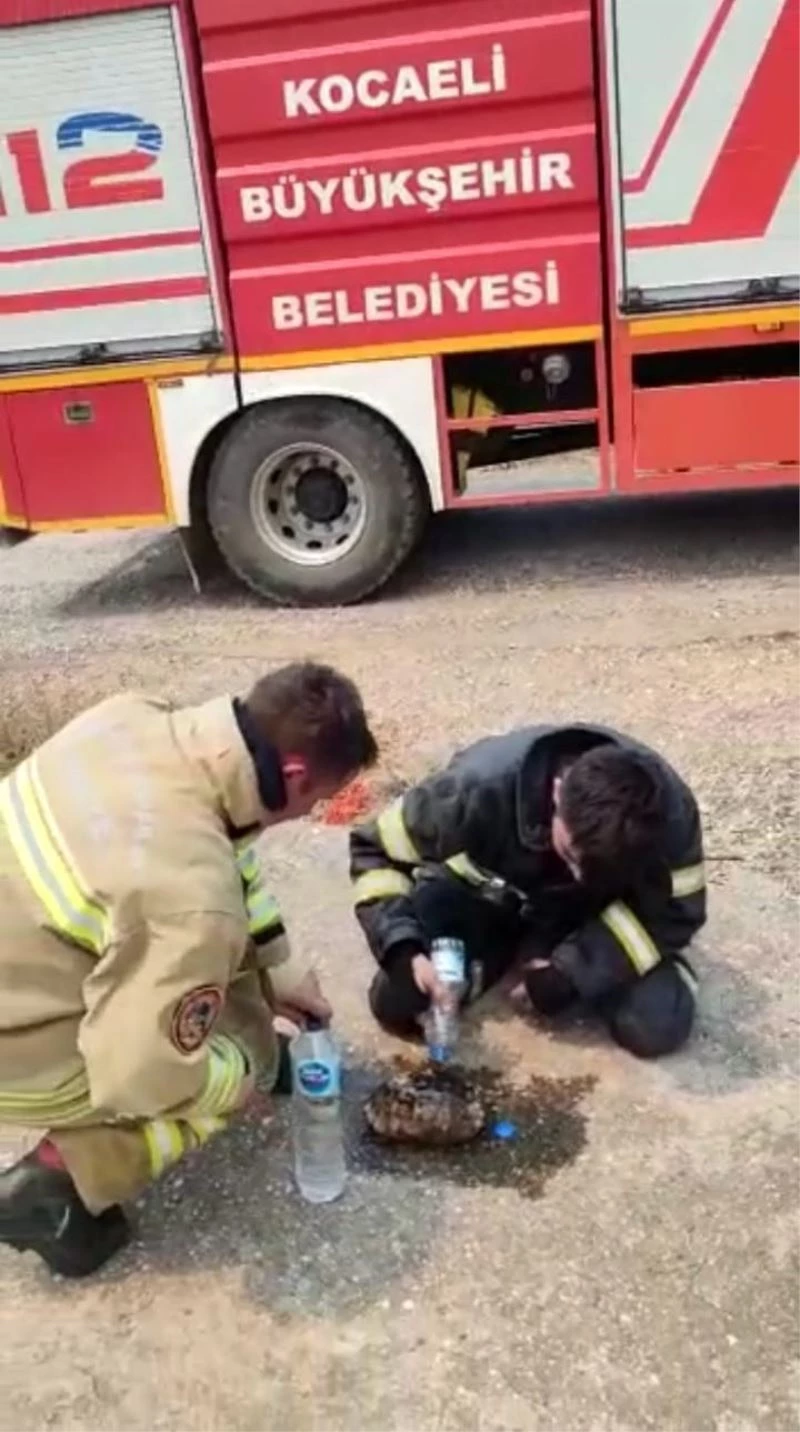 Antalya Manavgat’ta çıkan orman yangınları için Kocaeli’den bölgeye giderek alevlerle mücadele eden itfaiye erleri, alevlerin arasından kurtardıkları kaplumbağaya elleri ile su verdi.