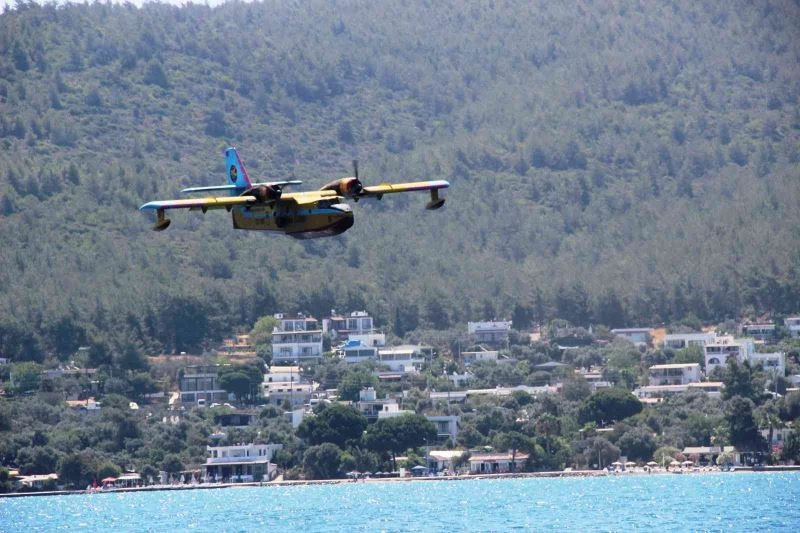 Muğla’da meydana gelen orman yangınları için Türk Hava Kurumu’nun (THK) 2 yangın uçağı Bodrum’un Güvercinlik açıklarında test uçuşu gerçekleştirdi.