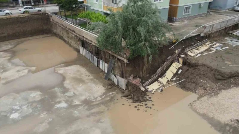 Hacılar Meydanı Mahallesindeki Emmioğulları Apartmanının yanında yaklaşık 2 ay önce bir inşaatın temel çalışmasına başlandı. Hafriyat çalışması sürerken apartmanın bahçe duvarında çökme riski oluşan alan demir direklerle geçici olarak güçlendirildi. Ancak son günlerde yaşanan yağışların etkisiyle zemini zayıflayan duvarın diğer kısmı bir anda çöktü.