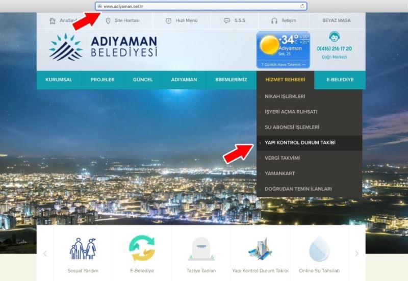 www.adiyaman.bel.tr adresli web sitesi üzerinden meclis kararları, su ödemesi, çevre temizlik ödemesi, inşaat maliyet bedelleri, arsa rayiç değerleri, bina aşınma oranları, ruhsat sorgulama, kira sözleşmesi sorgulama, tahakkuk bilgileri, borç sorgulama ve tahsilat bilgileri gibi hizmetleri online olarak vatandaşına sunan Adıyaman Belediyesi, geliştirilen sistem sayesinden bundan sonra yapı kontrol müdürlüğüne yapılan yapı başvurularının da online olarak yapabileceğini açıklandı.