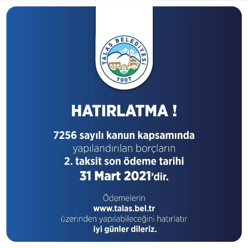 Konuyla ilgili bir hatırlatmada bulunan Talas Belediye Başkanı Mustafa Yalçın, belediyeye olan borçlarını yapılandıran vatandaşların, hak kaybı yaşamaması için taksitlerini düzenli olarak ödemesi gerektiğini ifade ederek, “7256 sayılı kanun kapsamında yapılandırılan borçların 2. Taksit ödemeleri 31 Mart Çarşamba günü sona eriyor. Yapılandırmadan yararlanan Talaslı hemşehrilerimizin bu tarihe kadar 2. taksitlerini ödemesi gerektiğini bir kez daha hatırlatıyorum” dedi.