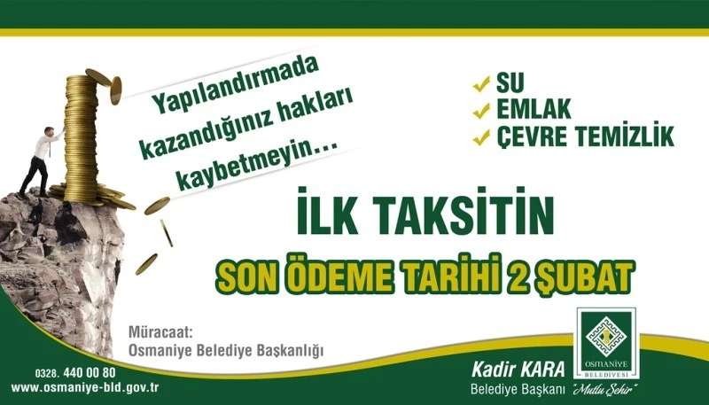 Osmaniye Belediye Mali Hizmetler Müdürlüğünden yapılan açıklamaya göre vatandaşlar arasında Torba Yasa olarak da bilinen 6552 Sayılı Kanun ile yeniden yapılandırılan kamu alacaklarının ilk taksit ödemesinde son günün 2 Şubat olduğu hatırlatıldı.