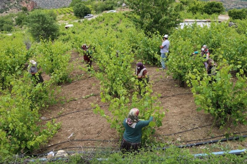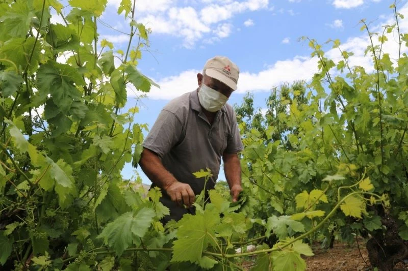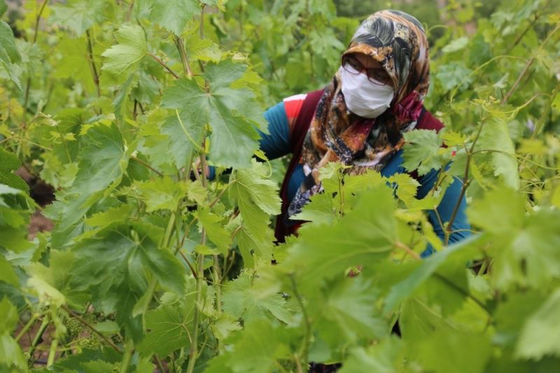 Türk yemek kültüründe sarmaların ana malzemesi olarak tercih edilen üzüm yaprağı, bağlardan titizlikle toplanarak pazarlara ulaştırılıyor. İlçeye bağlı Gaziler Mahallesinde üzüm yetiştiriciliği yapan Şengül Öğeç, yaprak hasadına başladıklarını söyledi. Zahmetli bir iş olduğunu belirten Öğeç, “Mayıs ayının yarısında yaprak hasadına başlıyoruz. Birbirimizin işlerini imece usulü yapıyoruz. 3 gün birimize gidiyoruz, 3 gün başka bir komşumuza gidiyoruz. Zahmetli bir iş ama kaliteli ürün alıyoruz. Sosyal mesafeyi koruyor ve hijyen kurallarına uyarak yaprak yolumu yapıyoruz. Haziran ayı ortasına kadar bu şekilde toplayacağız. Yaprağın beyaz üzüm yaprağı olması, tüysüz olması, parlak ve ekşimsi bir tadı olması nedeniyle Türkiye genelinde tercih ediliyor” dedi.