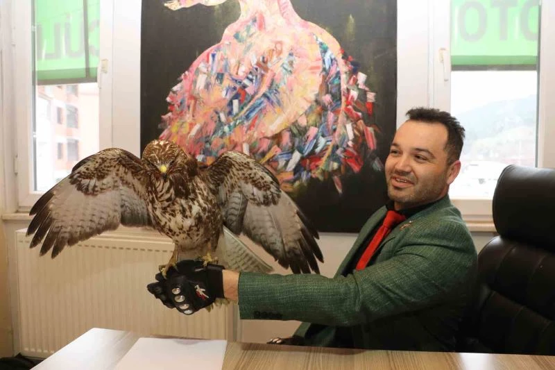 Uçamayan şahini tutup işyerine getirdiğini anlatan Temiz, “Kendini avcı zanneden insanlar tarafından kanadından vurulmuş. Besledik. Durumu şu an gayet iyi” dedi.