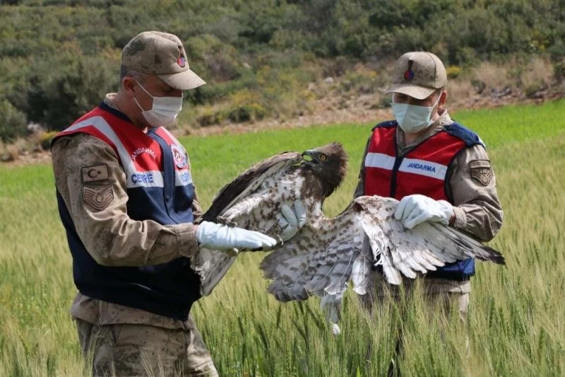 İlçe Jandarma Komutanlığı ekipleri, ilçeye bağlı Meydan Mahallesi’nde yürüttükleri önleyici kolluk devriyesi sırasında, arazide kanadından yaralı ve bitkin halde yılan kartalı buldu.