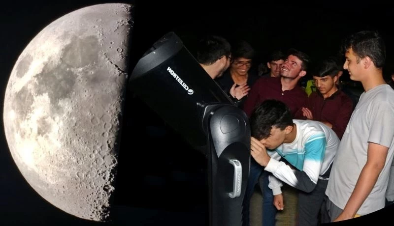 Hakkari’nin Yüksekova ilçesindeki Şemsettin Onay Anadolu Lisesinin bahçesinde kurulan teleskoplardan yarım ay içinde bulunan kraterleri görmek için öğrenci ve vatandaşlar sıraya girdi.