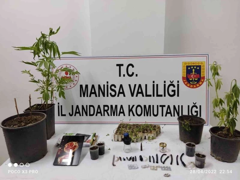 Manisa’nın Turgutlu ilçesine bağlı Sarıbey Mahallesi’nde yasadışı kenevir yetiştirildiği istihbaratı üzerine Turgutlu İlçe Jandarma Komutanlığı harekete geçti. Şüphelilerden N.K., Ö.K., O.D., H.T., E.T. ve E.Y. isimli şahısların evlerinde baskın yapan ekipler şüpheli N.K. ve şüpheli Ö.K. isimli şahısların ikametinde 25 kök ekili vaziyette bakımları yapılmış yaklaşık 40 santimetre uzunluğunda kenevir bitkisi, şüpheli E.Y. isimli şahısın ikametinde 47 adet fidan şeklinde köpük kartonlara ekili vaziyette boyları yaklaşık 15 santimetre uzunluğunda kenevir bitkisi, şüpheli O.D. isimli şahsın evinde uyuşturucu madde tartımında kullanıldığı değerlendirilen 1 adet hassas terazi, aynı evde bulunan E.T. isimli şahsın yapılan kaba üst aramasında yeleğinin sol iç cebinde uyuşturucu madde içiminde kullanılan 12 adet uyuşturucu kullanma aparatı tespit edildi.