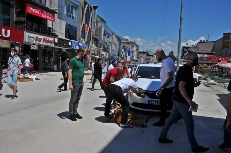 Düzce Belediyesi tarafından İstanbul Caddesi’nde yapımı devam eden çalışmalarda cadde araç trafiğine kapanmıştı. Yasak olmasına rağmen caddeye giren otomobilin tekeri çukura düştü.