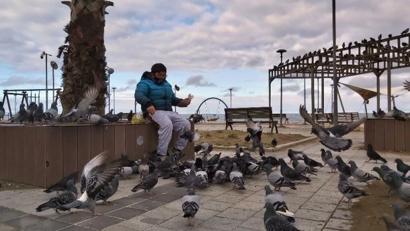 Karasu’da yaşayan küçük hayvansever Yiğit Seyit Günday, sokağa çıkma kısıtlaması nedeniyle kuşlara kimsenin yem vermediğini görünce duyarsız kalamadı. Evinin karşısında bulunan Sahilpark’a giden Yiğit, evindeki kuşlara verdiği yemleri güvercinlere paylaştırdı. Soğuğa aldırış etmeden Sahilpark’ta uzun süre kuşlara yem veren Günday, güvercinleri dakikalarca avucunda besledi. Kuşlara hafta içi de sokağa çıkma izni sırasında sürekli yem verdiğini söyleyen küçük hayvansever, “Artık beni ve sesimi tanıyorlar. Çağırıyorum, aynı yere geliyorlar” dedi.