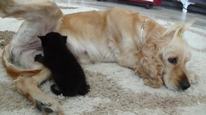 Aydın’ın Söke ilçesinde poşet içerisinde çöpe atılmış şekilde bulunularak eve getirilen yavru kediyi sahiplenen ’Lokum’ isimli köpek, ismi ’Zeytin’ konulan kediyi emzirerek annelik yapıyor. Köpeğin yavru kediye gösterdiği şefkat ise insanların içini ısıtıyor.