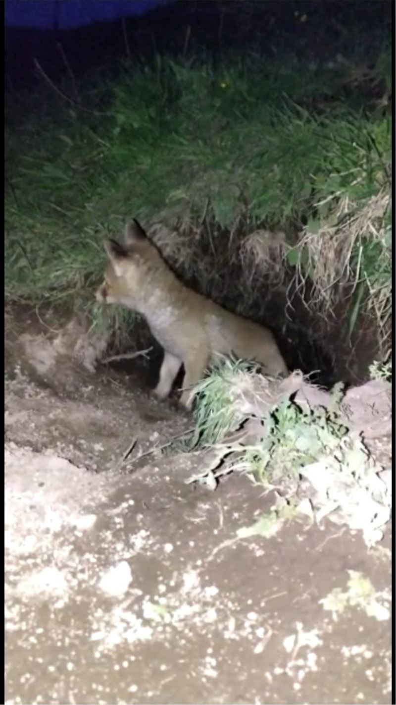 Ardahan’a yaklaşık 17 kilometre uzaklıkta bulunan Tepeler Köyünde yuva yapan tilki, yavrularının doyurmak için yiyecek aramaya gidince, yavrulardan bir tanesi kendisini yuvadan dışarı attı. Annesinin yiyecek getirmesini dışarıda, yuvalarının üzerinde bekleyen tilki yavrusu her hangi bir ses duyunca yuvaya girerek saklanıyor.