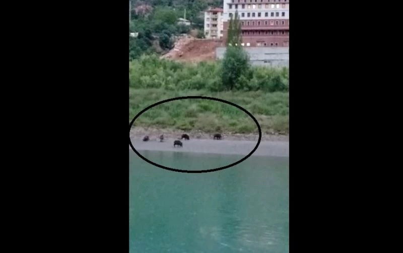 Erzincan’ın Kemaliye ilçesinde yavrularında bulunduğu domuz sürüsü, Fırat Nehri kenarında cep telefonu kamerasına yansıdı.