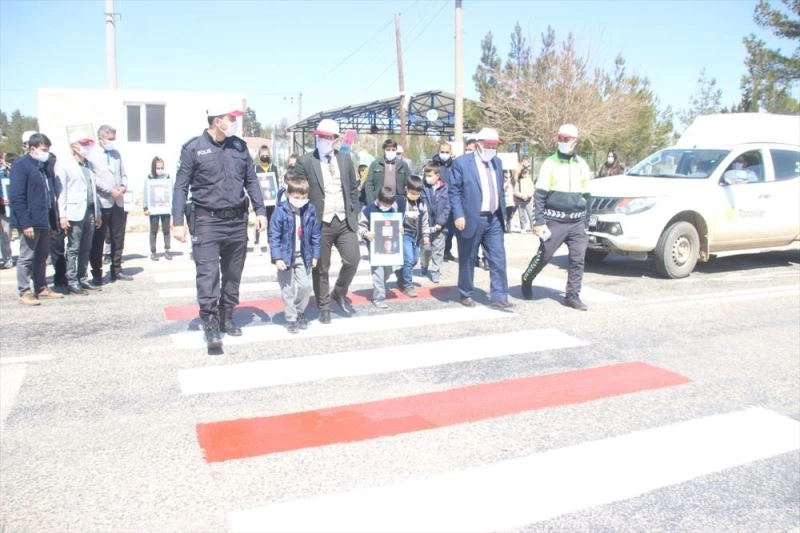 Anamur Kaymakamı Aydın Memük ve katılımcılar okul önünde yaya geçidindeki orta çizgiyi kırmızıya boyadı.