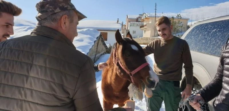 Her tarafın kar ile kaplı olduğu Bayraklı Yaylası’nda Drone ile arama yapan gönüllü hayvanseverler kayaların üstünde yaşam savaşı veren açlıktan ve soğuktan ölmek üzere olan atı buldular. Atın karnını doyuran gönüllü vatandaşlar daha sonra Bayraklı Yaylasından aldıkları atı yaklaşık 20 km yol yürüdükten sonra Taşören Mahallesine getirdiler. Hayvansever gönüllü vatandaşlar atın yem ihtiyaçlarını karşılamak için seferber olurken, sağlıklı bir ortamda dinlenmeye alınan atın son durumunun son derece sağlıklı olduğu ifade edildi.