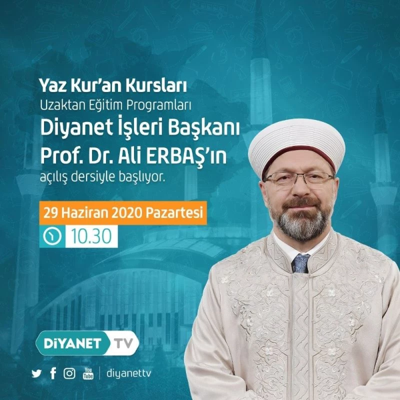 İlk dersi yarın saat 10.30’da Diyanet İşleri Başkanı Prof. Dr. Ali Erbaş’ın vereceği Yaz Kur’an Kursları, Diyanet TV’den yayınlanacak programlarla yapılacak.