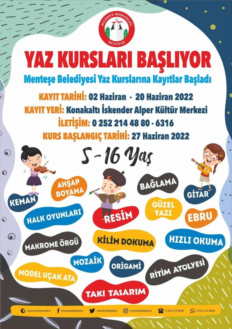 Menteşe Belediyesi tarafından 05 - 16 yaş arasındaki çocuklara ahşap boyama, bağlama, ebru, gitar, güzel yazı, halk oyunları, hızlı okuma, keman, kilim dokuma, makrome örgü, model uçak (Ata), mozaik, origami, resim, ritim atölyesi ve takı tasarım olmak üzere 16 farklı alanda kurs verilecek.