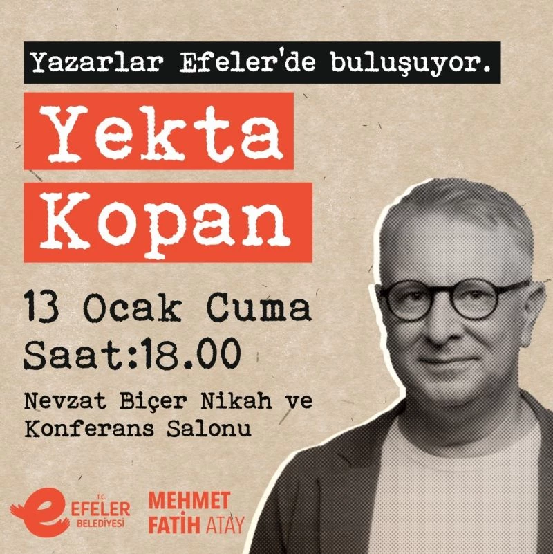 Efeler halkını programa davet eden Başkan Atay, “Yazarlar Efeler’de Buluşuyor” etkinliklerimize ara vermeden devam ediyoruz. Yekta Kopan’ı Efeler’imizde ağırlayacak olmaktan mutluluk duyuyoruz. Tüm vatandaşlarımızı Cuma günü saat 18.00’de Nevzat Biçer Nikâh ve Konferans Salonu’na davet ediyorum” dedi.